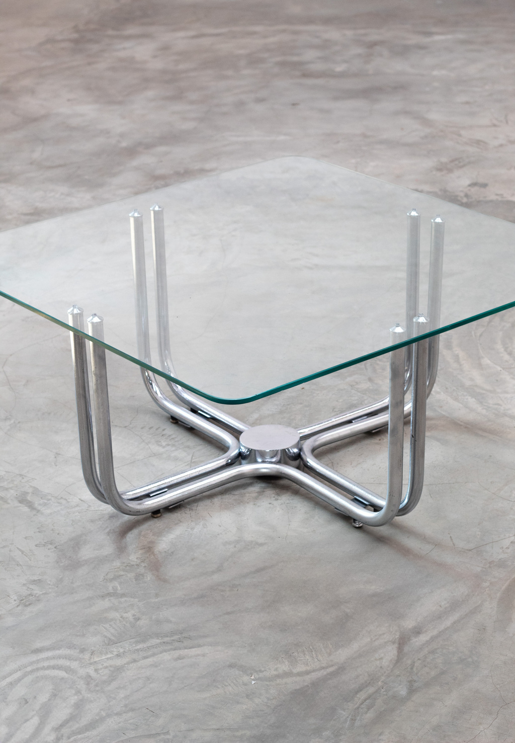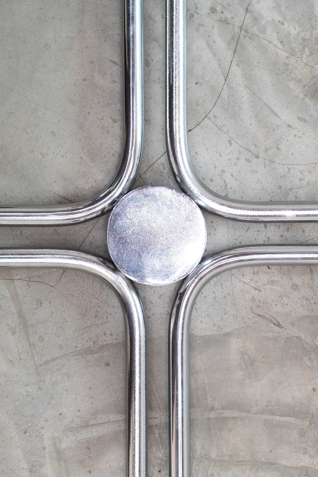 escultural e original mesa lateral (serve bem como mesa de centro) confeccionada em aço tubular cromado e vidro temperado 10mm (novo). peça se assemelha com a mesa "784" do designer italiano Gianfranco Frattini. contém marcas do tempo, verifique na imagem. há resquícios de tinta prateada em algumas partes.